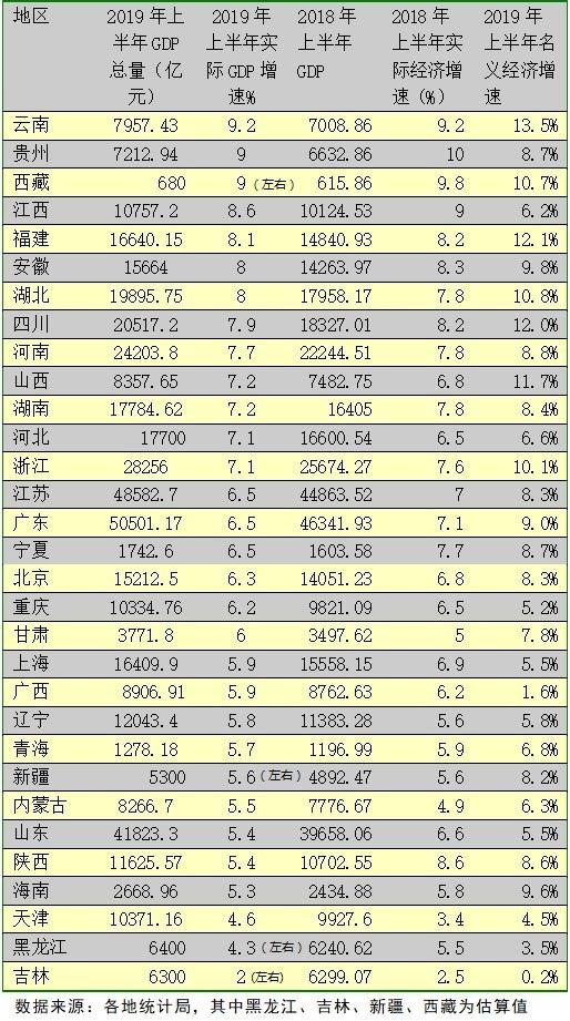21世纪经济研究院汇总各地数据发现,今年上半年全国经济总量前几名仍是广东、江苏、山东、浙江、河南、四川等地,但是经济增速最快的地区是云南,位居全国第一,增速为9.2%,第二名并列的是贵州和西藏,均为9%,江西为8.6%,位居第四。今年上半年增速最慢的地区是吉林。