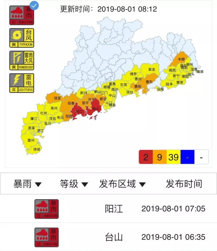 广东共发布2 个红色暴雨预警(阳江、台山↑↑)9 个橙色暴雨预警(新会、阳西、阳春、信宜、恩平、开平、丰顺、惠阳、惠东↑↑)39 个黄色暴雨预警