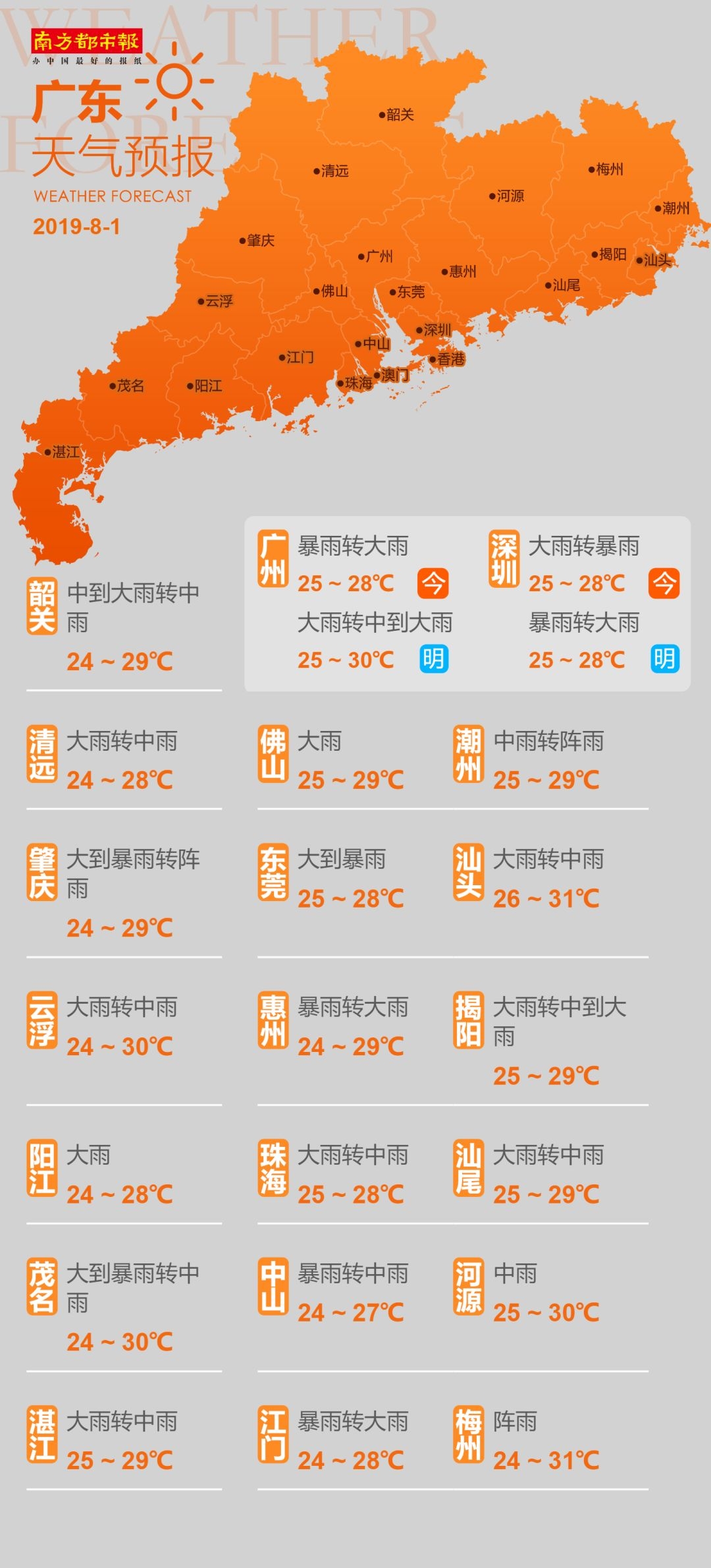 8月1日,粤西、珠江三角洲、粤东沿海市县有大到暴雨局部大暴雨,其中惠州、深圳、珠海、中山、江门、阳江、茂名、湛江有暴雨到大暴雨,粤北市县有中到大雨局部暴雨。最高气温:粤北市县32℃~34℃,其余市县30℃~32℃。