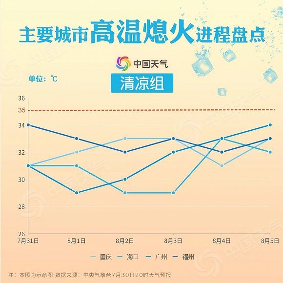 重庆、海口、广州、福州未来六天最高气温都在35℃以下,广州明天的最高气温甚至只有29℃,可以说是夏日里难得的清凉了。不过需要提醒的是,华南地区的小伙伴们在享受清凉的同时,也要做好防台风的准备。