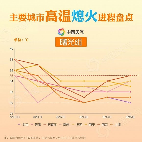 北京、天津、石家庄、郑州、济南今天仍会出现高温天气,石家庄的最高气温还可能达到38℃。不过曙光就在前方,从明天开始,这五个城市的高温都将“熄火”。西安、南京、上海则要再多坚持一天,从后天开始,当地的最高气温也会降到35℃以下了。