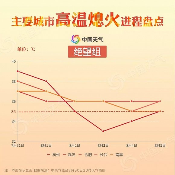 对于杭州、武汉、合肥、长沙、南昌来说,未来的日子就有点绝望了。杭州7月下旬实现了高温的全满贯,进入8月,火力依然不减,虽然3日、4日有个短暂的缓解,但到了5日,高温又会卷土重来。而武汉、合肥、长沙、南昌就更惨了,连个喘息的机会都没有。