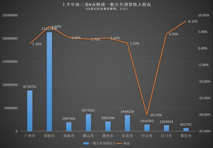 更值得注意的是增速。今年上半年,珠三角9个城市的一般公共预算收入增速依次为:肇庆8.15%、深圳6.60%、江门4.30%、珠海3.20%、惠州3.10%、佛山2.70%、东莞1.50%、广州1.30%、中山为-20.10%。