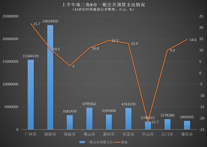 此外,惠州加快了16.9个百分点、东莞加快了6.3个百分点、佛山加快1.5个百分点。也就是说,上半年珠三角9市中一共有超过半数城市加大了支出力度。