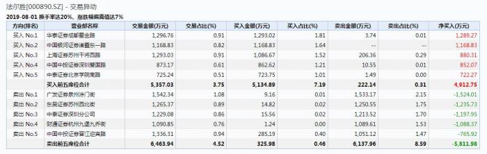 8月1日,法尔胜再拉涨停,报收6.84元/股,换手率高达28.09%。7月29日至8月1日,法尔胜连续4个交易日涨停并登上龙虎榜,期间涨幅达46.47%。