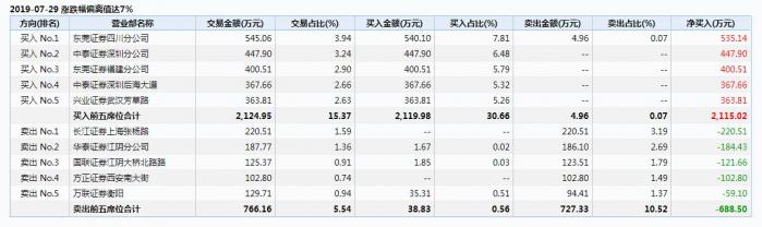 7月29日,东莞证券四川分公司位居买入席位第一,共计买入540.10万元,卖出4.96万元,净买入535.14万元。第二日,其便现身卖出席位之首,卖出564.44万元,买入121.34万元,净卖出443.10万元。