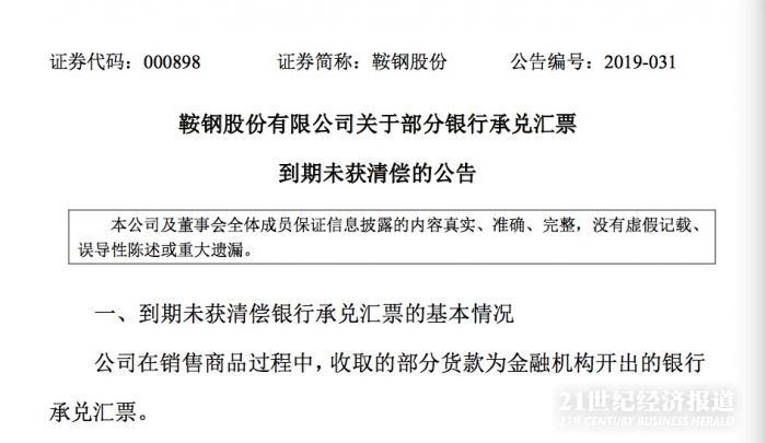 至于对公司财务状况的影响,鞍钢股份称,由于公司生产经营稳定运行,资金较为充足,2019年一季度公司经营活动产生的现金净流入人民币20.09亿元。因此,上述银行承兑汇票逾期未获偿付,不会对公司当期现金流构成重大影响。