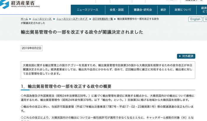 此表态可谓是“以牙还牙”,就在几小时前,日本内阁会议通过相关法案的修订,决定将韩国剔除出贸易优惠“白名单”,相关修订案将于8月7日正式公布,并于8月28日起正式实施。