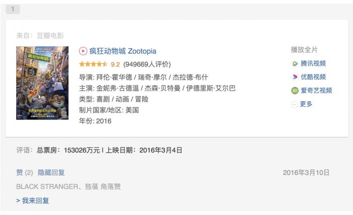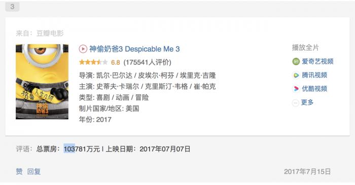 据豆瓣电影数据显示,在已上映的动画电影中,在《哪吒》身后,是《疯狂动物城》15.3亿(上映日期:2016年3月4日),由华特·迪士尼电影工作室、皮克斯动画工作室联合出品的《寻梦环游记》票房12.1亿(2017年11月24日),和10.3亿票房的《神偷奶爸3》(2017年07月07日)。