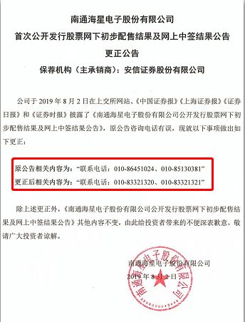 8月2日晚,海星股份发布一则公告,更正了保荐机构安信证券的联系电话。