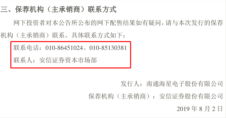 海星股份本周三刚刚进行了新股申购,在其8月1日晚发布的发行结果公告中,联系人一栏署名“安信证券资本市场部”,但联系电话却被发现是中信建投证券资本市场部的。投资人若拨打此电话询问项目信息,中信建投负责接线的同学怕是要一脸问号了。