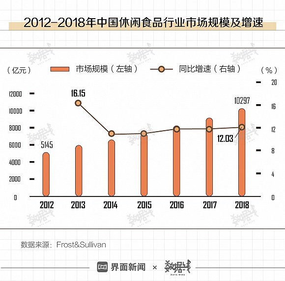 Frost&Sullivan数据显示,2018年中国休闲食品行业市场规模突破1万亿。2018年市场规模同比增速为12.03%,为近五年新高。