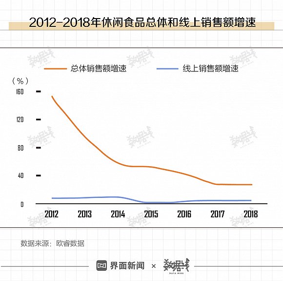 欧睿数据显示,2018年线上休闲食品总体销售额增速已经从2012年的接近160%降至不足40%,线上零食销售额增速步入中速时代。