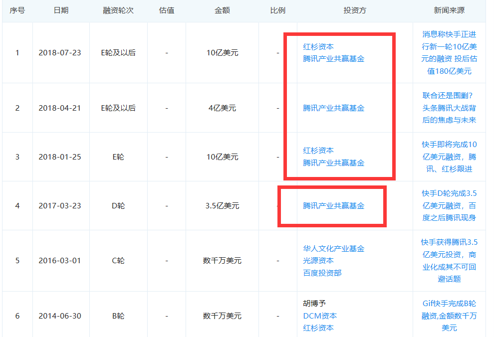 2018年1月,有消息称,快手即将完成10亿美元E轮融资,红杉资本和腾讯投资2018年4月,快手获得腾讯投资的4亿美元融资。今年7月,有消息称,快手正进行新一轮10亿美元融资,红杉资本和腾讯参与投资。