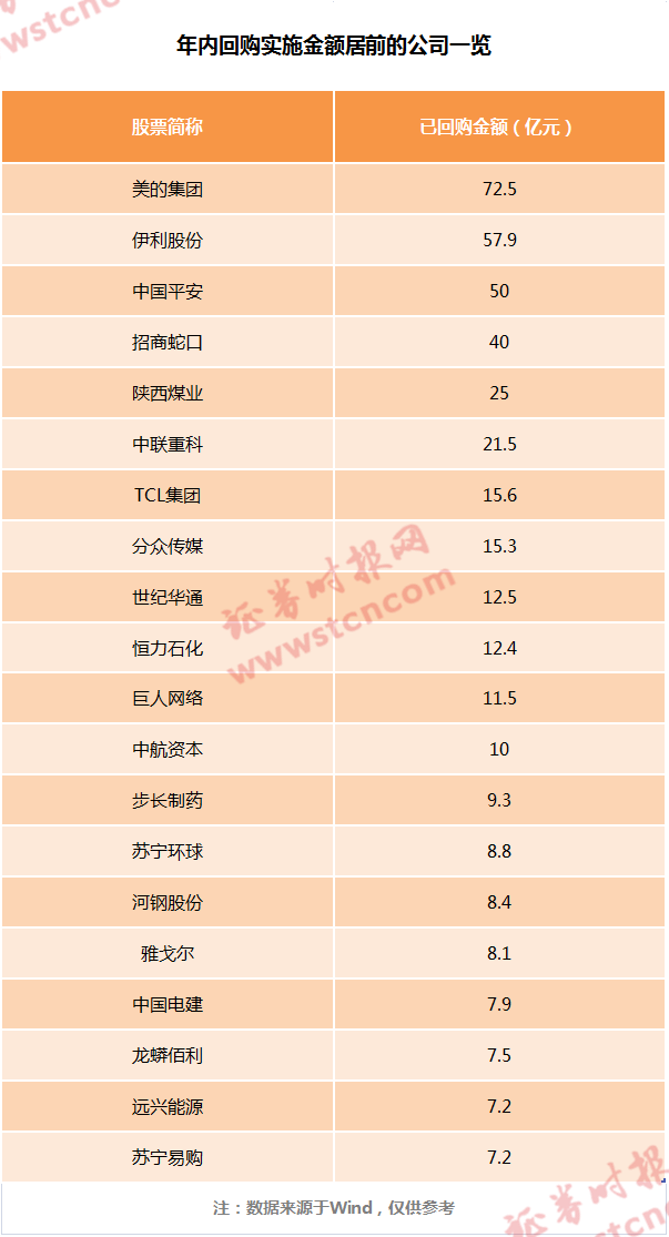 除美的集团和伊利股份外,中国平安、招商蛇口、陕西煤业、中联重科、TCL集团、分众传媒、世纪华通、恒力石化年内回购实施金额也居于前列。