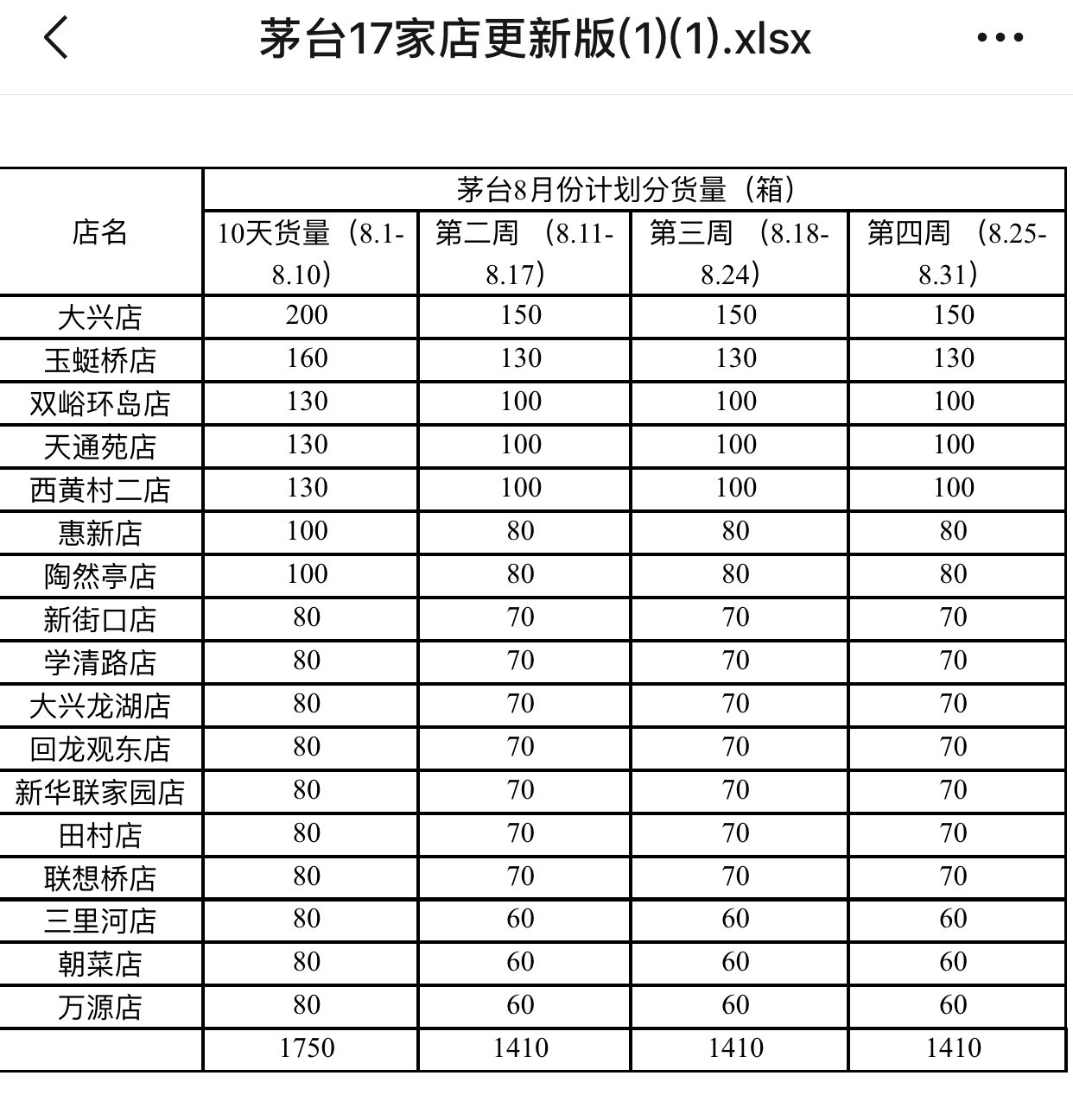 物美内部人士向中证君(ID:xhszzb)提供的资料显示,此次预售活动在物美全北京市的17家门店同时举行,在8月1日-10日的10天里,计划分货量为1750箱,随后的三周,计划分货量均为1410箱。