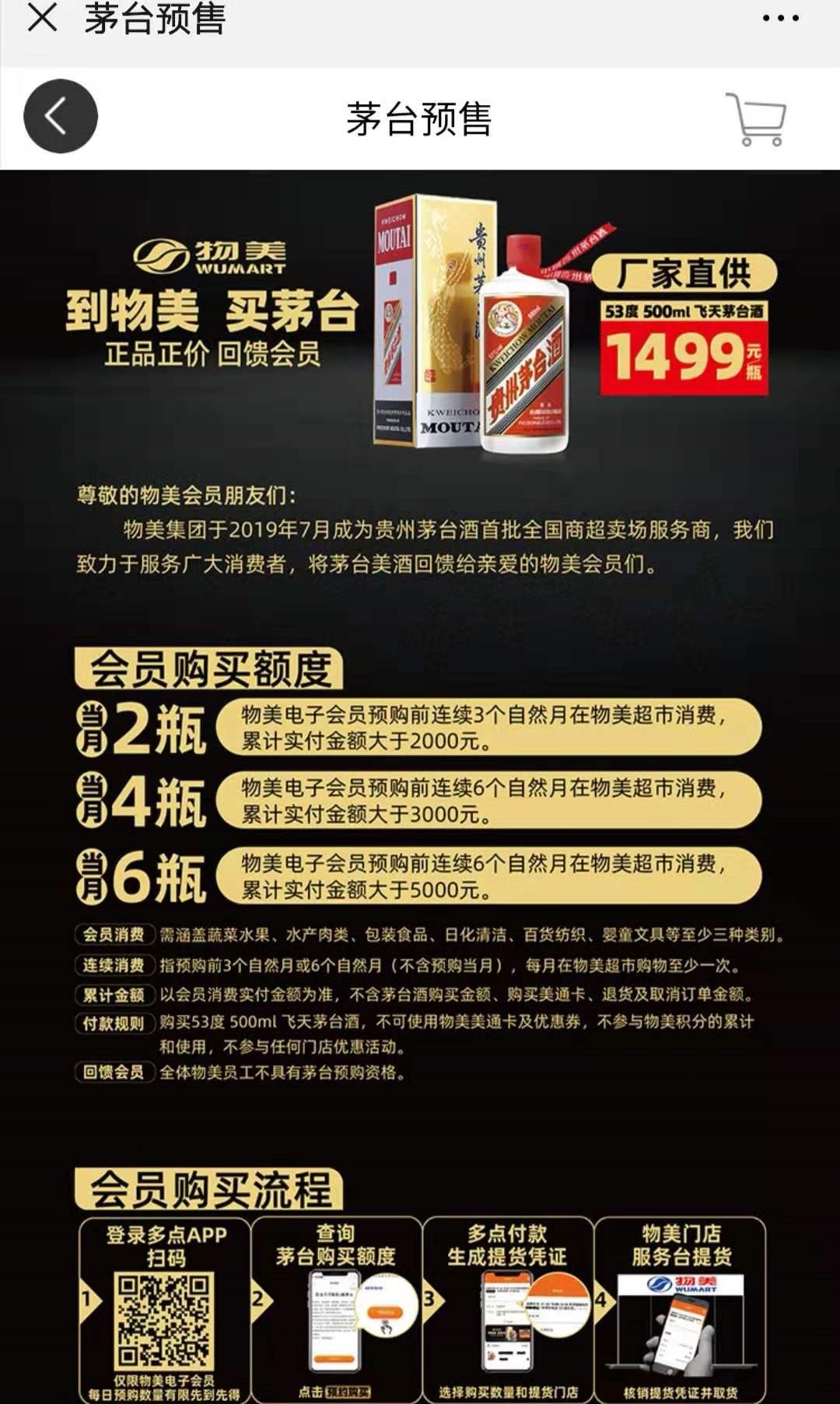 中证君发现,物美为1499元的飞天茅台设置了非常高的门槛。比如,要首先成为物美会员,并且连续三个月在物美超市消费,且累计实付金额超过2000元,才有当月2瓶的配额。