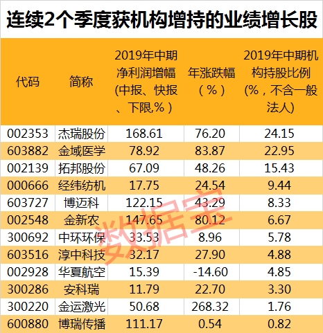绩优股不仅获得杠杆资金青睐,同时也备受机构关注。数据宝统计显示,披露中报个股中,中报盈利且同比增长10%以上、连续2个季度获机构增持(不含一般法人)的共有12股,包括最新披露中报股杰瑞股份、金新农、金域医学等。