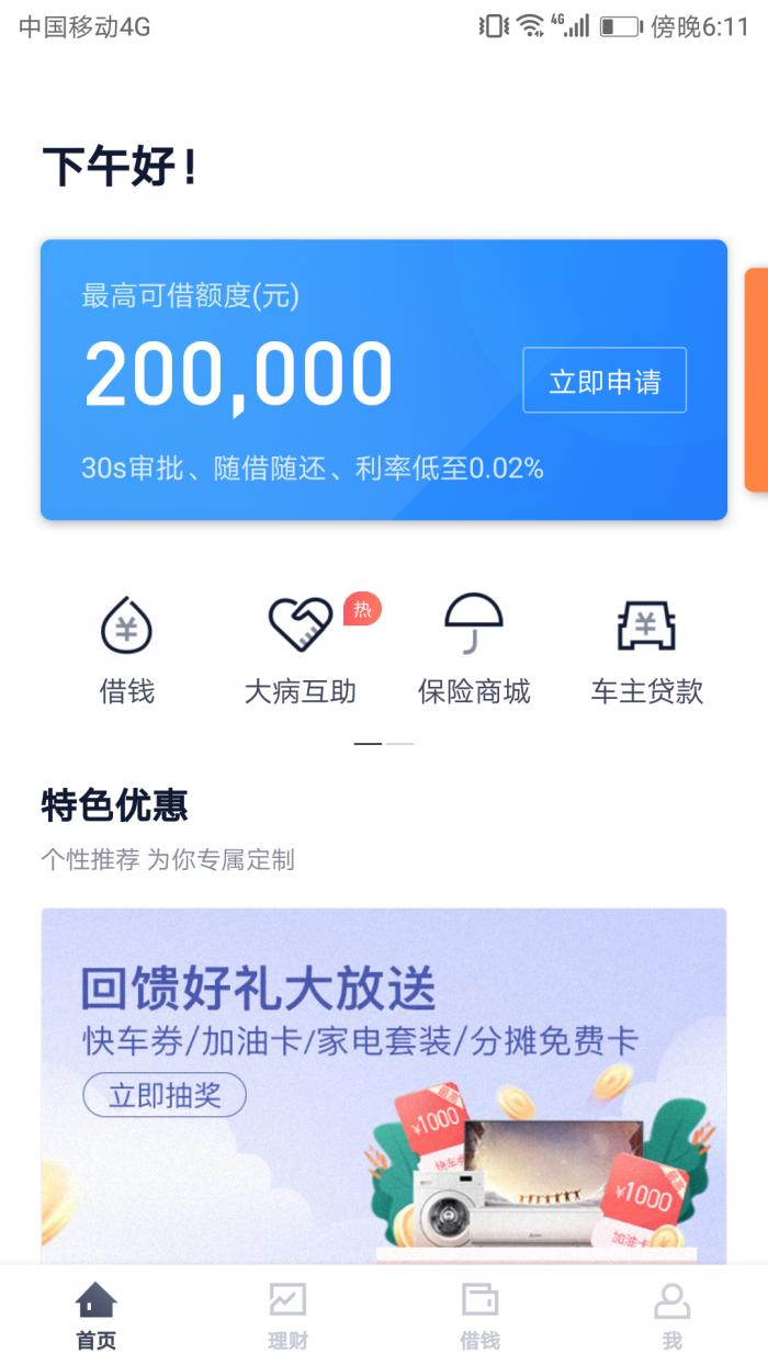 记者还下载了滴滴金融App,其主推包括借钱、大病互助、保险商城、车主贷款、金桔宝、分期购车等服务。