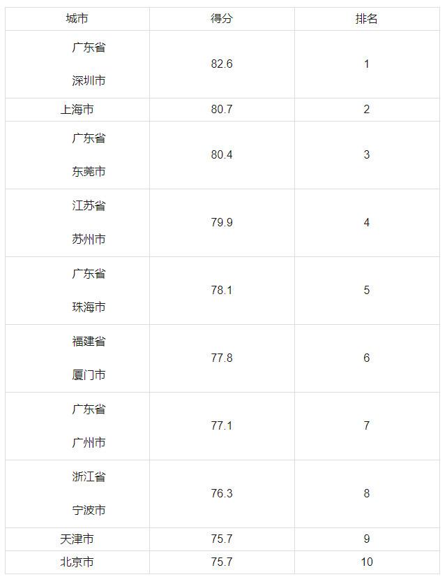和前一年榜单相比,进入前10强的深圳、东莞、珠海、广州得分均创出了新高,而且和后面城市的差距在拉大,和排名在前的城市差距在缩小。如在“2018年中国外贸百强城市”榜单中,排第3位的东莞总分为80.4分,与排第2位的上海分差由0.6分缩小到0.3分。