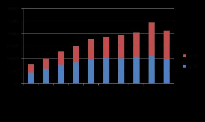 十年来上半年彩票销量(单位:亿元)