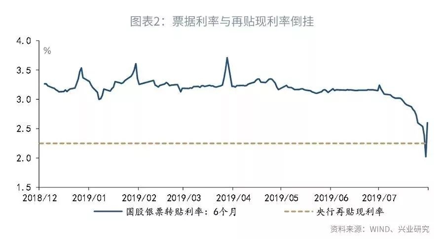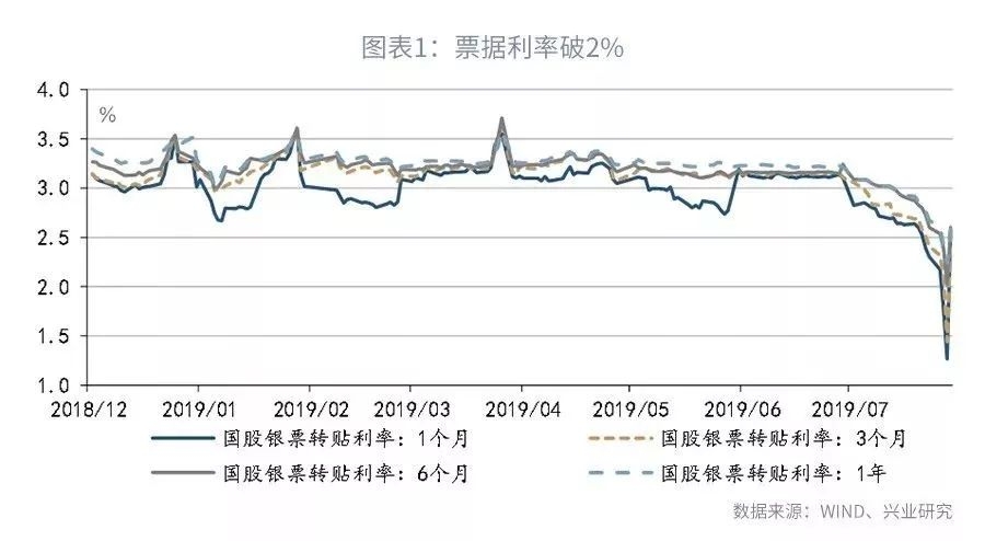 7月30日,1个月国股银票转贴利率跌破2%,下降到1.77%的水平。到7月31日,3个月国股转贴利率也下跌至1.44%的低位。票据利率出现两个层面的倒挂:其一,票据转贴利率与央行再贴现利率倒挂。再贴现的期限在6个月以内,而7月31日6个月国股转贴利率仅为2.02%,低于2.25%的再贴现利率。其二,票据利率与NCD利率倒挂。7月31日6个月NCD利率为3.48%,较同期限国股转贴利率高出146bp。这说明,在不考虑保证金存款收益的情况下,票据利率不仅显著低于资金成本,也低于向央行获取再贴现融资的成本。