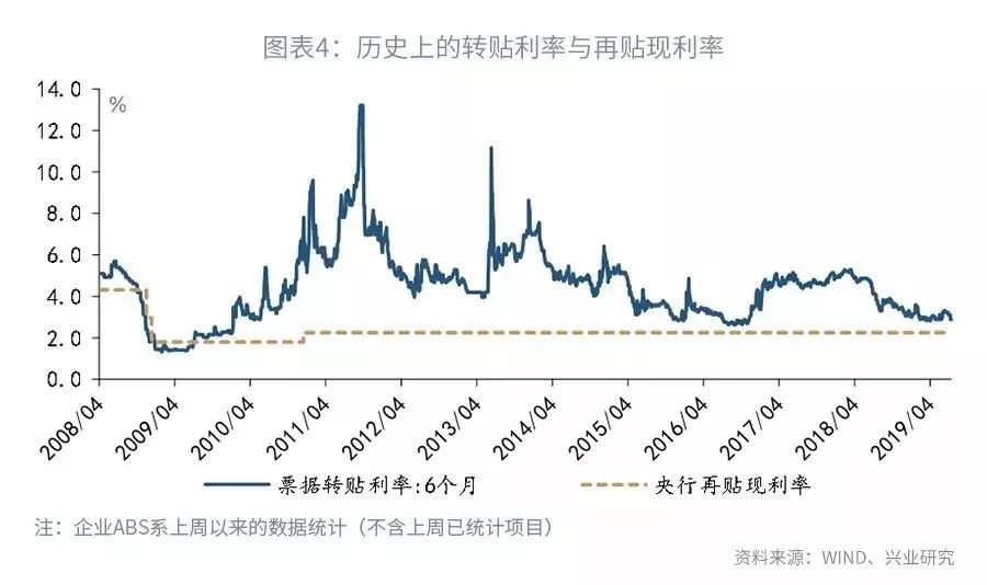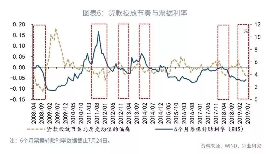 我国的信贷投放有鲜明的季节性特征。2008年至2018年期间,历年上半年信贷投放累计值占全年贷款的比例平均在59%左右。然而2008年上半年贷款投放占全年的比例仅为50%。2008年6月贷款余额增速为14.1%,较2007年同期回落了2.4个百分点。2019年第二季度新增人民币贷款同比下降了3100亿。如果按照全年贷款增长13%来大致估算,上半年贷款投放占比不到55%,较历史均值低4个百分点。数据显示,当贷款投放节奏显著低于历史均值之后,往往会出现票据利率下行行情。