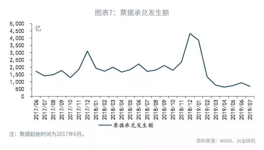 此外,近期票据监管趋严、票据承兑额下降也一定程度上影响了票源的供应,加速了票据利率的下行。2019年3月央行在解读金融数据时表示:“金融管理部门鼓励具有真实贸易背景的票据业务发展,同时也不会容忍票据融资套利情况。”2019年7月银保监会办公厅发布《中国银保监会办公厅关于进一步加强企业集团财务公司票据业务监管的通知》,加强财务公司票据业务监管。2019年3月以来票据承兑额显著回落,3月至7月票据日均承兑额都在1000亿以下。