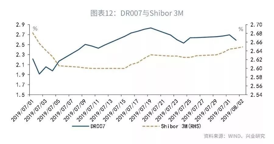 第二,小微融资成本降一个百分点的目标完成概率较大。7月央行货币政策司司长孙国锋:“再加上承担或者减免信贷相关的费用,相当于降低其他融资成本0.54个百分点,加在一起小微企业综合融资成本降幅已经超过了一个百分点,成效是显著的。”因此,7月中下旬DR007与Shibor 3M都有所上升。