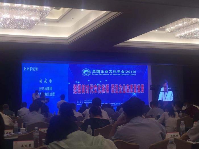 (图:宗庆后在“全国企业文化年会(2019)”上介绍娃哈哈党建工作 夏旭田 北京拍摄)
