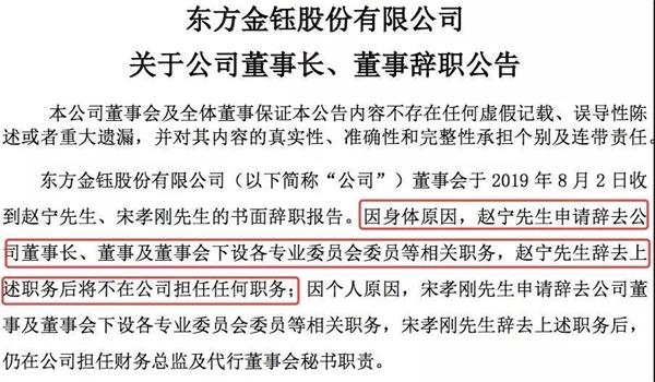 除了赵宁辞职以外,8月4日东方金钰还公告,因个人原因,宋孝刚申请辞去公司董事及董事会下设各专业委员会委员等相关职务。辞去上述职务后,宋孝刚仍在公司担任财务总监及代行董事会秘书职责。