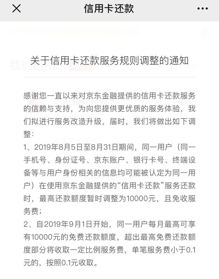 记者注意到,京东金融APP“还信用卡”选项里,8月5日起,最新调整了信用卡还款服务规则。据京东金融规则调整通知: