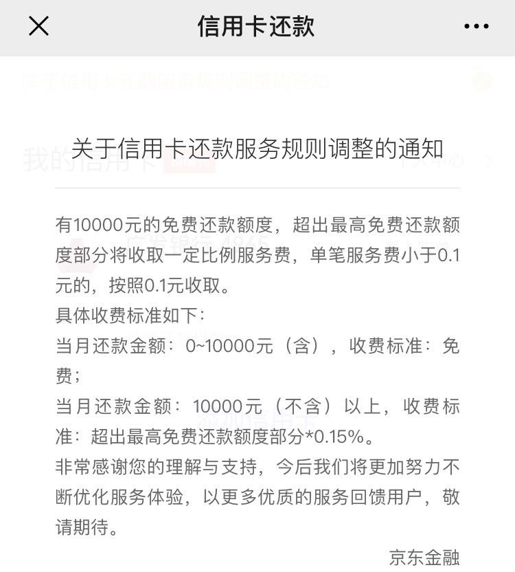 2、2019年9月1日起,同一用户每月最高可享1万元的免费还款额度,超出免费还款额度后,超出的部分将收取一定比例服务费,单笔服务费小于0.1元的,按照0.1元收取。收费标准:当月还款金额:0-10000元(含)收费标准:免费;当月还款金额:10000元(不含)以上收费标准:还款金额超出部分*0.15%。