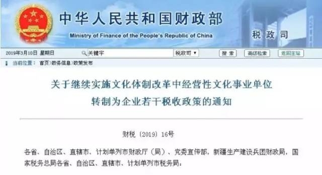 2019年2月16日,财政部官网就发布消息,财政部、税务总局、中央宣传部联合发布《关于继续实施文化体制改革中经营性文化事业单位转制为企业若干税收政策的通知》。