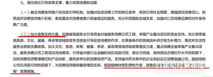 起因是江苏省委办公厅在近日发布了一份促消费的文件,在《关于完善促进消费体制机制进一步激发居民消费潜力的实施意见》中提出“鼓励错峰休假和弹性作息,探索在有条件的地区实施2.5天小长假政策措施”。