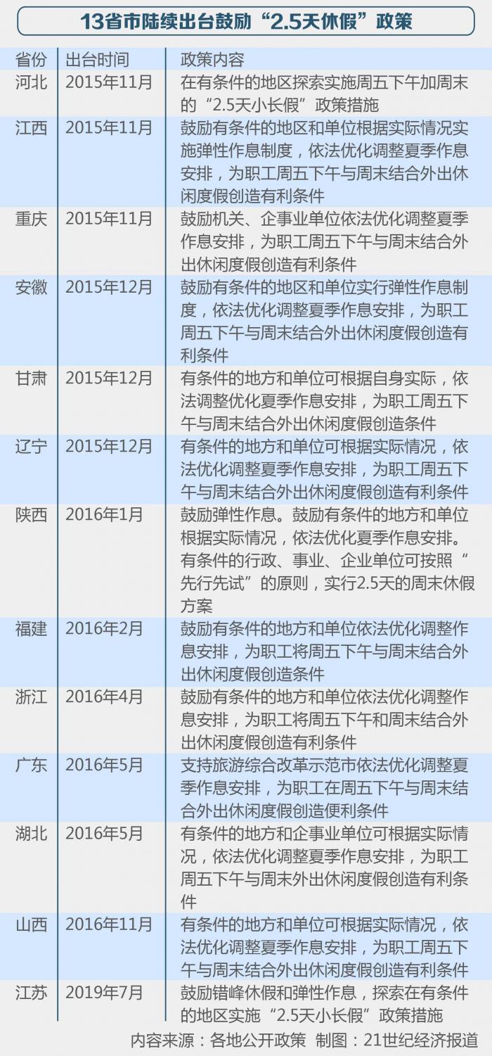 据21世纪经济报道记者梳理,目前已有河北、江西、重庆、甘肃、辽宁、安徽、陕西、贵州、福建、浙江和广东等13个省份依次出台了鼓励2.5天休假的意见。