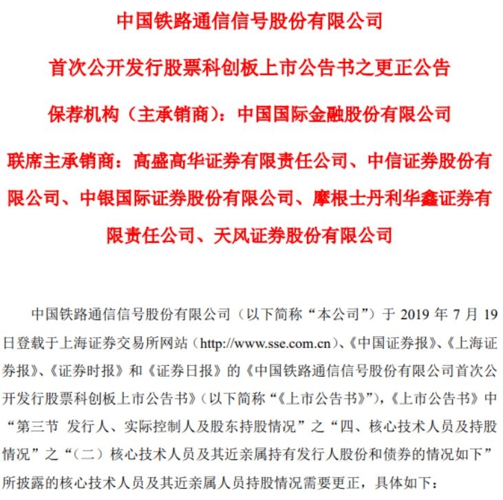 8月4日下午,中国通号公告称,其上市公告书中所披露的核心技术人员及其近亲属人员持股情况需要更正。此时,距离其7月19日发布上市公告书已半月有余。