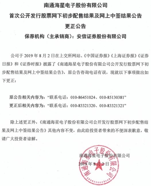 8月2日午间,海星股份发布更正公告,对此前发布的中签结果公告的保荐机构(主承销商)联系方式进行更正。