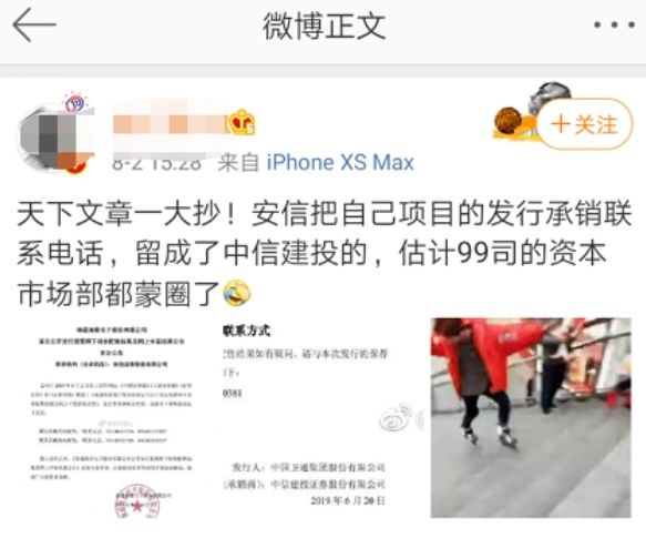 在更正公告发出后,即有业内人士在微博上进行“举报”,称主承销商安信证券将联系电话留成了中信建投的电话。