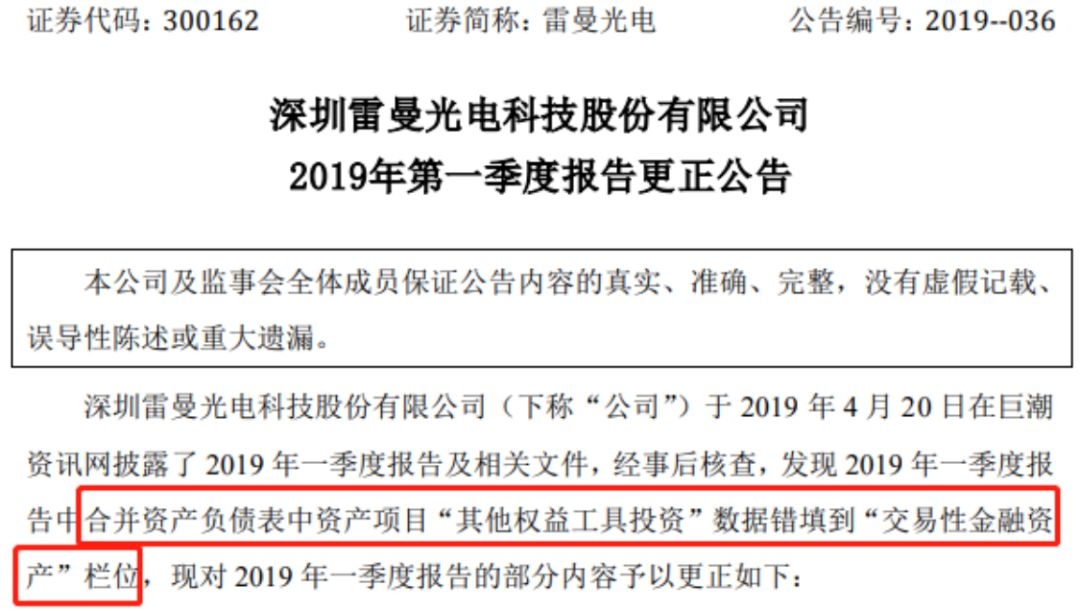 而就近期上市公司公告信息来看,失误情况更是五花八门:例如,在半年报即将披露之前,雷曼光电紧急发现公司一季报资产负债表科目数据发生错填,其他权益工具投资错填到交易性金融资产栏位。