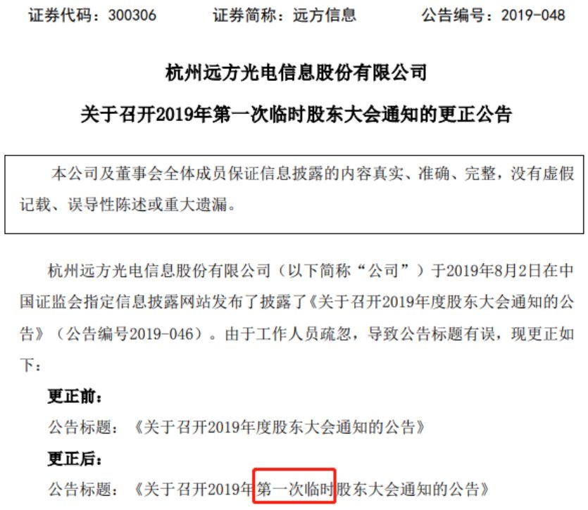 远方信息则在召开临时股东大会时忘记披露“临时”,导致公司在8月2日召开的股东会成为“2019年度股东大会”,此时距离公司“2018年度股东大会”召开完毕仅有3个月。