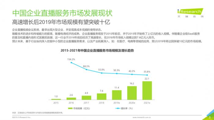 在这场由微赞直播主办的直播创新峰会上,互联网研究第三方机构艾瑞咨询发布了《2019中国企业直播服务市场研究报告》(下称《报告》)。《报告》显示,2018年中国企业直播服务市场规模达到7.6亿元,2021年中国企业直播整体市场规模更是有望突破20亿元大关。
