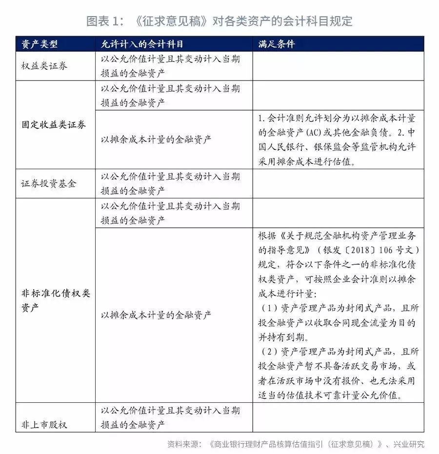 对于权益类证券、证券投资基金和非上市股权,《征求意见稿》均规定应计入“以公允价值计量且其变动计入当期损益的金融资产”,根据是否有活跃市场价格,采用不同的估值方法,这与公募基金的估值指引的原则大体一致。