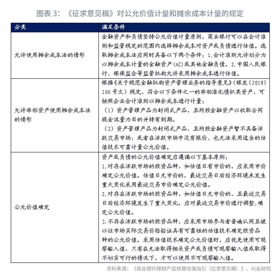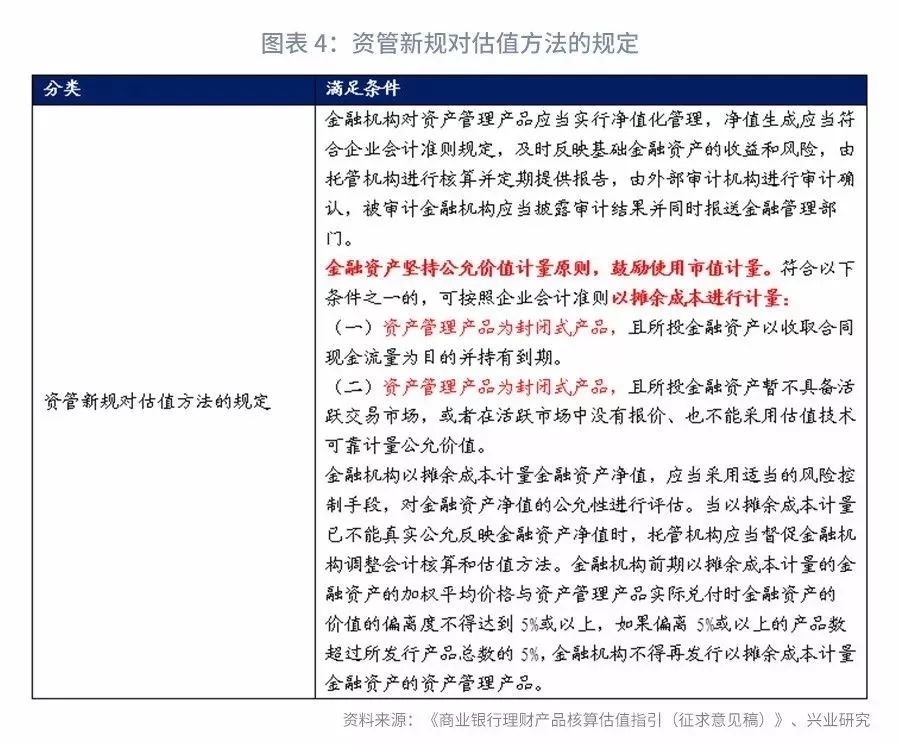 本次《征求意见稿》属于在资管新规的框架下、银行业协会课题的研究成果。从资管新规的估值方法规定来看,“金融机构对资产管理产品应当实行净值化管理,净值生成应当符合企业会计准则规定……金融资产坚持公允价值计量原则,鼓励使用市值计量。符合以下条件之一的,可按照企业会计准则以摊余成本进行计量”;资管新规确立了各类资管产品估值的统一规定,即净值化管理、公允价值计量、符合企业会计准则规定,在公允价值计量原则之下,大多数产品应采用市值计量,只有符合特定条件的两类封闭式产品,可以采用摊余成本法。我们认为,未来理财产品、公募基金等各类资管产品,在估值方法和产品改革上,将以资管新规的要求作为共同的标准,逐步向满足资管新规要求的方向靠拢。