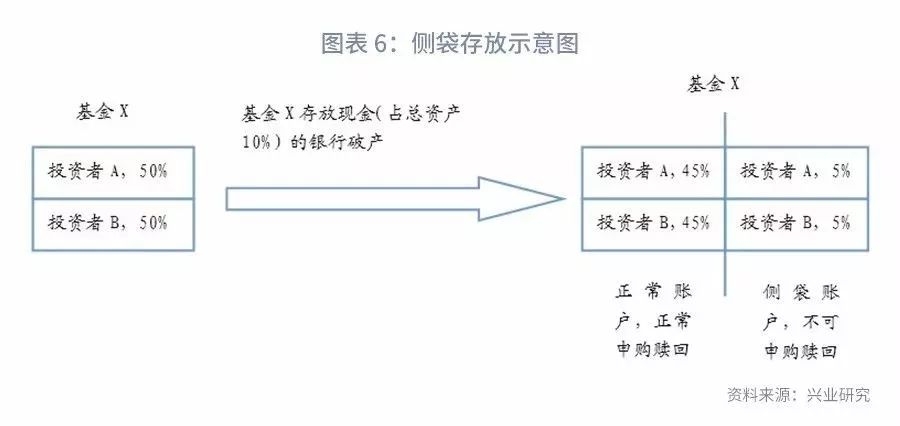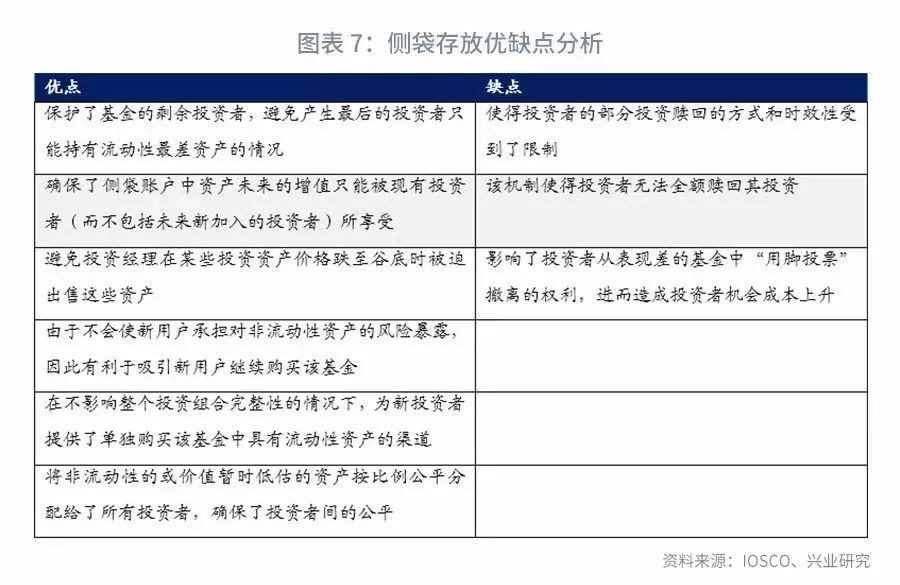 “侧袋存放”是管理基金流动性风险的重要工具。此前2018年2月1日,国际证监会组织(IOSCO)发布《开放式基金流动性及风险管理报告——最佳实践及相关事项》(以下简称“《报告》”)中对“侧袋存放”这一流动性风险管理工具作出了详细阐述和分析。《报告》指出,“侧袋存放”是在基金部分资产流动性下降、难以估值或价格受到非理性低估时,将单个基金投资的资产根据流动性强弱等因素分别存放在两个不同的账户中(正常账户与侧袋账户),侧袋账户中存放流动性差、难以估值、价格遭遇非理性低估(或暂时坏账)的资产;现存每个投资人按比例分配正常账户和侧袋账户的资产。正常账户可以继续正常估值,并开放申购赎回;侧袋账户将单独估值,不再开放申购,赎回也受到很大限制。在正常账户和侧袋账户分割确定后,新进入的投资者只能向正常账户发起申购。相比于其他流动性风险管理工具,“侧袋存放”的主要优点在于:能够避免投资经理在投资资产价格跌至谷底时被迫处置该资产;在投资标的破产时有利于清算有序开展,因此,往往用于投资资产破产、违约风险上升、兑付困难等情景下。缺点在于限制了投资者赎回的权利。相关研究请参见我们的报告《开放式基金流动性管理“工具箱”——国际证监会组织对开放式基金流动性风险管理的报告》[1]。