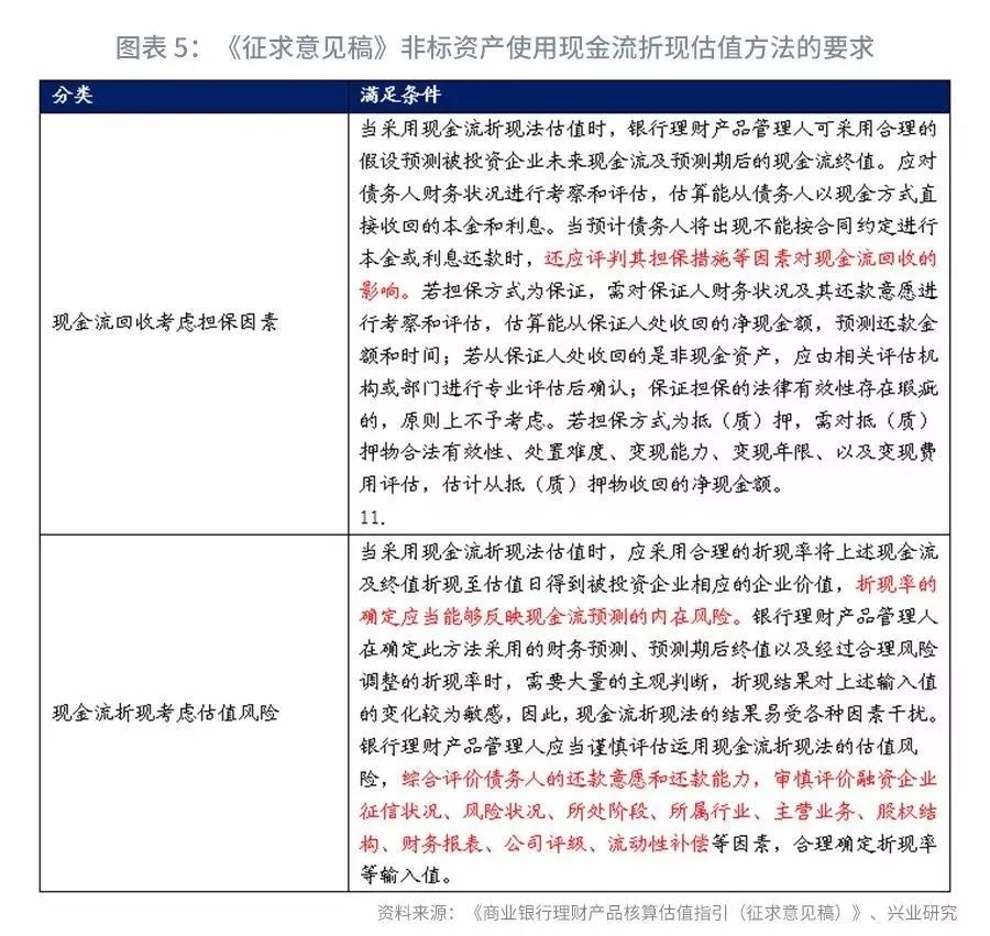 《征求意见稿》依照资管新规,规定以下两类情形下,非标资产可以采用摊余成本法:“(1)资产管理产品为封闭式产品,且所投金融资产以收取合同现金流量为目的并持有到期。(2)资产管理产品为封闭式产品,且所投金融资产暂不具备活跃交易市场,或者在活跃市场中没有报价、也无法采用适当的估值技术可靠计量公允价值。”不满足上述情形的,采用市值法,并且给出了现金流估值的基本模型。此外,《征求意见稿》还要求银行考虑担保对现金流回收情况的影响、现金流折现的估值风险等。