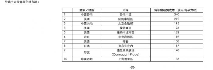 上述指数追踪全球65个城市的76个主要写字楼市场最高质素写字楼的租金走势,其中香港中环连续五年高锯全球最高。今年第一季度,中环每年租赁成本(包括租金、税项及服务费)达每平方呎340美元(每月平均每平方呎221港元),纽约市中心以每年每平方呎212美元位居第二。