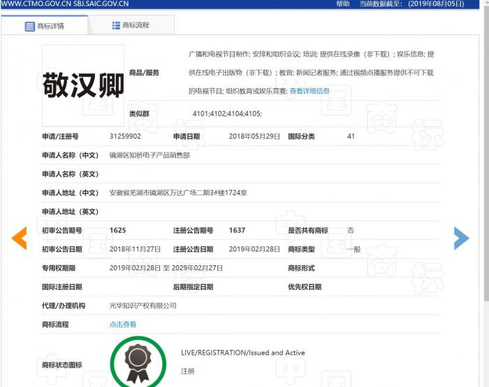 中国商标网信息显示,第31259902号被使用在第41类商品/服务,即“广播和电视节目制作; 安排和组织会议; 培训; 提供在线录像(非下载); 娱乐信息; 提供在线电子出版物(非下载); 教育; 新闻记者服务; 通过视频点播服务提供不可下载的电视节目; 组织教育或娱乐竞赛”。
