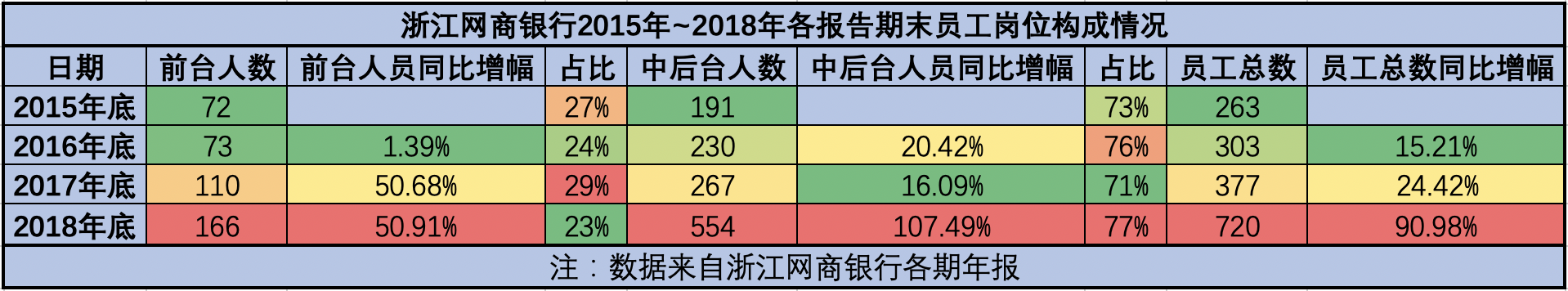 这也意味着,从2015年底至2018年底,三年间,浙江网商银行在增加94名前台人员的同时,中后台人员迅猛增加了363人,占比提升至77%。