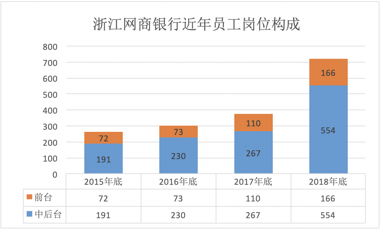 从之后该行披露的数据可以看到,随着业务发展,浙江网商银行的人才团队在随后的数年时间里也在不断扩容。截至2018年底,该行员工总数已升至720人,其中前台人员166人,中后台人员554人。